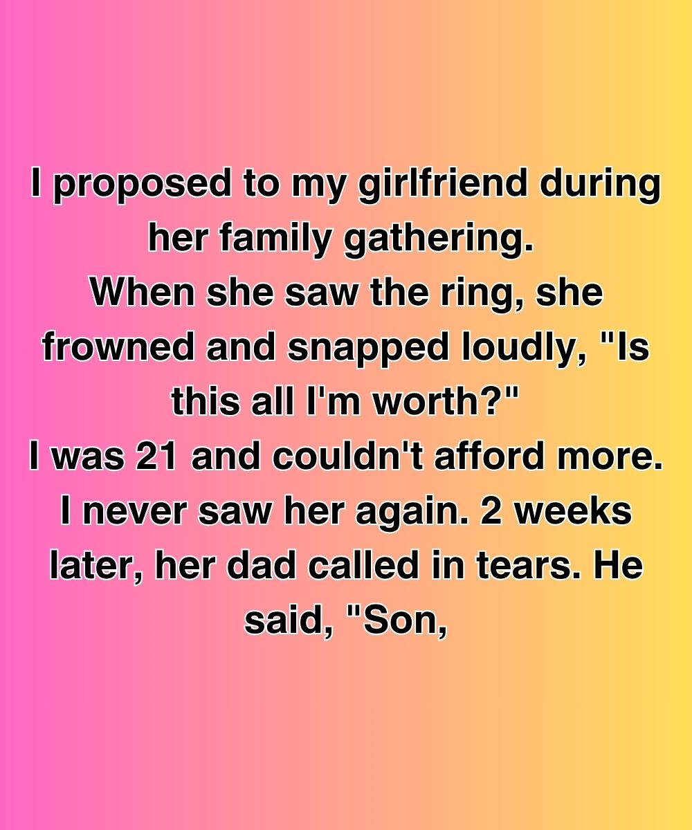 I proposed to my girlfriend during her family gathering. When she saw the ring, she frowned and snapped loudly, “Is this all I’m worth?” I was 21 and couldn’t afford more. I never saw her again. Two weeks later, her dad called in tears. He said, “Son…”